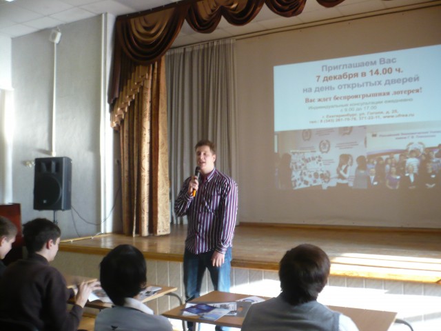 Образовательный марафон прошёл 8 ноября 2013 года в нашей школе. Перед учащимися 10-11 классов выступили представители УрГЭУ, Екатеринбургского центра «Обучение за рубежом», Российского экономического университета им. Г.В.Плеханова, Уральского института экономики, управления и права. Учащимся были представлены данные ВУЗы, рассказано об условиях поступления, обучения, специальностях.