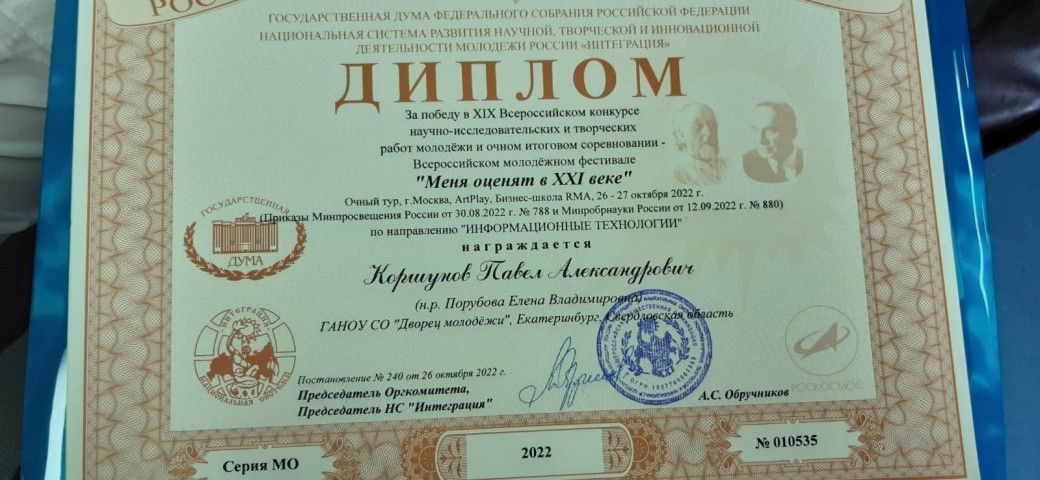 Поздравляем с победой во всероссийском конкурсе «Меня оценят в XXI веке» ученика 11«Б» класса Коршунова Павла!