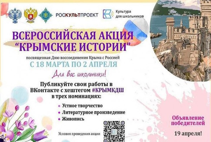 Приглашаем вас присоединиться к Всероссийской акции «Крымские истории», посвящённой Дню воссоединения Крыма с Россией. Дни проведения акции – с 18 марта по 2 апреля.