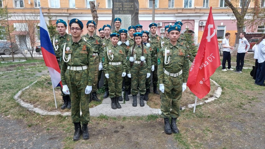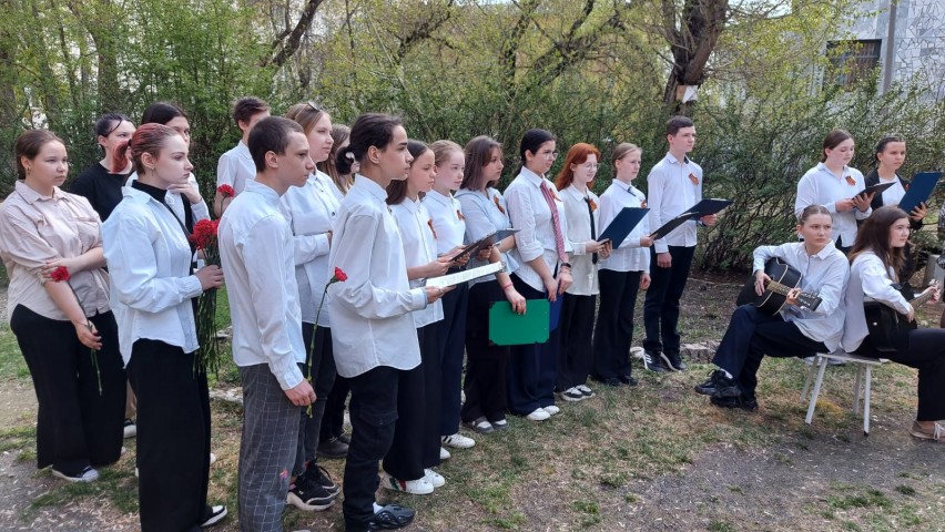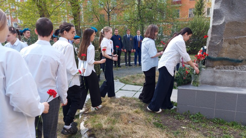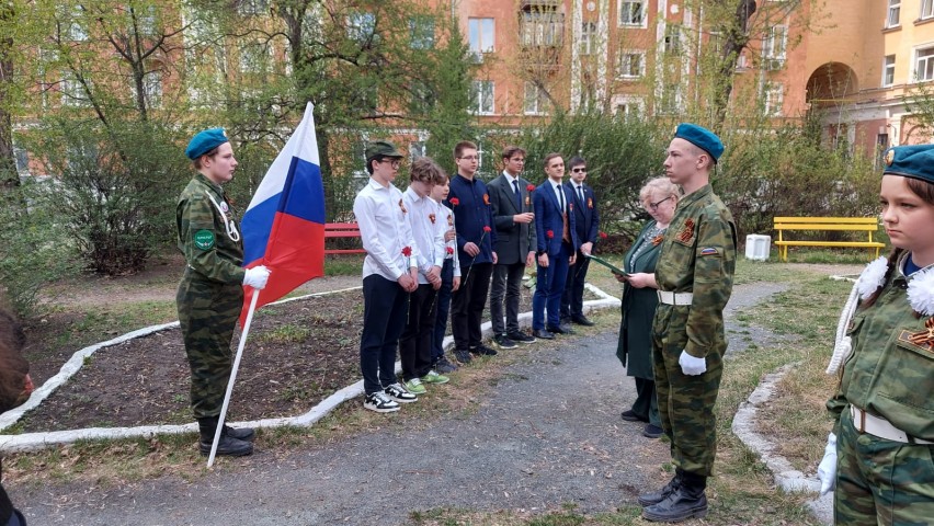 В рамках городской акции «Память Победы» учащиеся 7-в класса, юнармейский отряд «Крылья», юноши 10-х классов, педагоги школы совместно с общественной организацией «Ветеран» 3 мая 2023 года провели урок мужества у обелиска уральцам-первогвардейцам 3-й гвардейской Волновахской ордена Суворова стрелковой дивизии на ул Куйбышева, 48.
