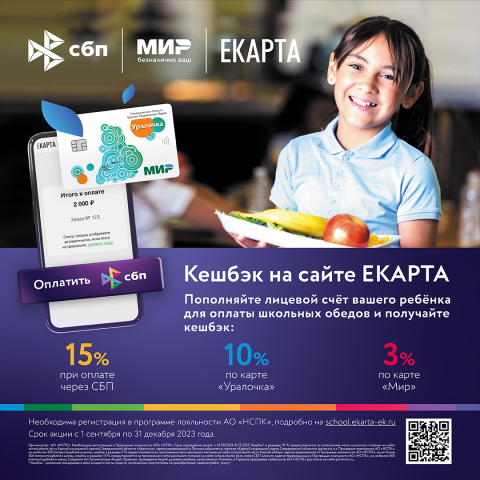 В период действия акции с 01.09.2023 по 31.12.2023, организованной при участии АО «НСПК» и Администрации города Екатеринбурга, родители (законные представители) обучающихся муниципальных общеобразовательных организаций (далее – организации), использующие для оплаты карту «Мир» или Систему быстрых платежей (далее – СБП), смогут вернуть до 15 % средств, потраченных