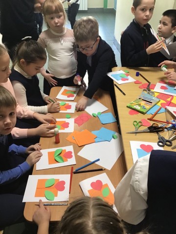 Ученики 8-х классов школы на мастер-классах учились создавать букеты из конфет своими руками. На переменах ученики 1-4 классов своими руками создавали простые, но симпатичные открытки для своих родных и близких, а организовали данный мастер-класс ученики 5-6 классов. Вся начальная школа стала участником проекта «Кинолекторий», где они посмотрели мультипликационные фильм «Мамин помощник» и обсудили его. И, конечно, молодые люди 7 марта поздравляли прекрасную половину нашей школы с наступающим праздником, подарив тем самым огромное количество положительных эмоций!