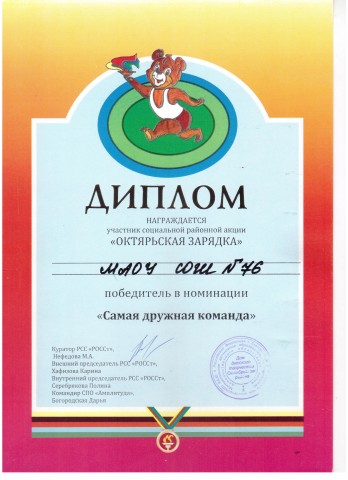 Самой дружной командой социальной акции «Октябрьская зарядка» стала команда 7 «В» класса ( классный руководитель Соловьева Т.В., учитель физической культуры Андриевских И.С.) Молодцы, так держать!