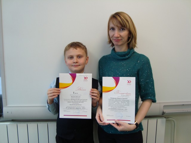В конце весны учащиеся тогда ещё вторых классов приняли активное участие в городском конкурсе «В лабиринтах природы». Данный конкурс проходил в рамках Стратегического проекта Администрации города «Экологическое просвещение населения города Екатеринбурга до 2015 года». Девиз конкурса в 2014 году: «Откроешь природу - найдешь путь к себе!» Ребята могли выбрать одно или несколько заданий, предложенных организаторами конкурса, в соответствии со своим возрастом и интересами. В начале ноября были опубликованы долгожданные результаты конкурса. От всей души поздравляем ученика уже 3-г класса Мамонова Николая под руководством Немировской Натальи Сергеевны, занявшего I место в номинации «Загадочные растения».