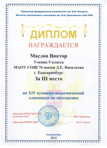 Поздравляем ученика 5-б класса Маслова Виктора призера (3 место) XIV вузовско-академической олимпиады по математике.