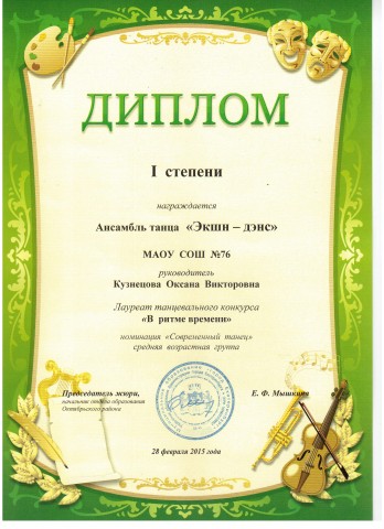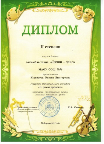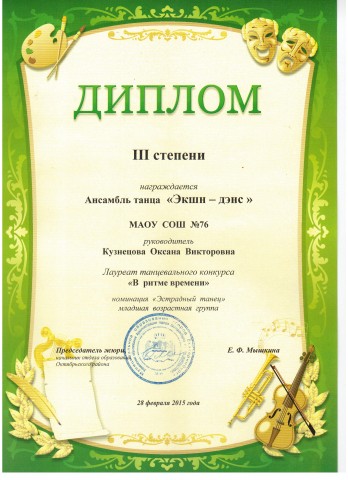 Поздравляем школьную студию танца «Экшн-дэнс» с победой (1,2,3 место) на районном конкурсе танца «В ритме времени» в номинациях «Современный танец», «Эстрадный танец», руководитель Кузнецова Оксана Викторовна, педагог дополнительного образования.
