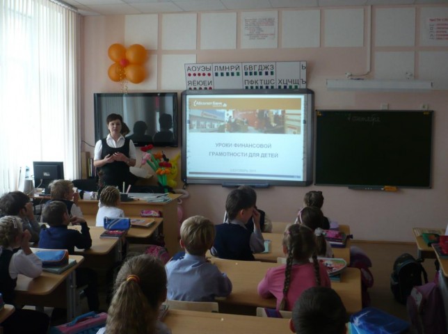 Сотрудники Абсолют Банка во главе с руководителем Бизнес-Центра Е.Н Ислентьевой, специалистом по маркетингу Е.Ю.Берсеневой провели встречи с учащимися 3-х классов. Ребятам были показаны красочные, интересные презентации, рассказывающие об истории возникновения монет, банкнот, пластиковых карт.