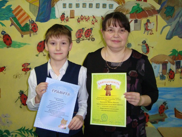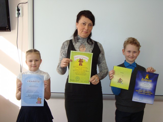 Окончание четверти – время подводить итоги. Наконец, стали известны результаты Всероссийского конкурса-игры по языкознанию «Русский медвежонок». Ученик 3-б класса Кузнецов Евгений стал победителем конкурса среди учащихся 3 классов, заняв 1 место. Среди участников из 4-х классов образовательных учреждений РФ одной победительниц стала Брюховецкая Анастасия, ученица 4-в класса. Призёрами конкурса названы Боровских Анастасия, ученица 3-б класса и Малов Роман, ученик 4-г класса, занявшие 2 место. Ребята награждены дипломами и памятными подарками от организаторов конкурса Центра дополнительного образования «Одарённый школьник» (г.Киров). Ребята, мы гордимся вами. От всей души поздравляем педагогов, подготовивших победителей и призёров Райкову Светлану Германовну (3-б), Буркову Елену Вениаминовну (4-в) и Кардашину Марину Юрьевну (4-г).