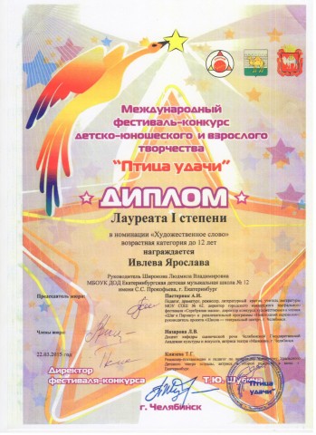 Поздравляем Ивлеву Ярославу, ученицу 4-в класса, занявшую 1 место в международном фестивале-конкурсе детско-юношеского творчества "Птица удачи" в номинации "Художественное слово".