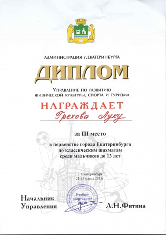 Третье место на первенстве города Екатеринбурга по шахматам среди мальчиков до 13 лет занял ученик 3-Г класса нашей школы Грехов Лука.
