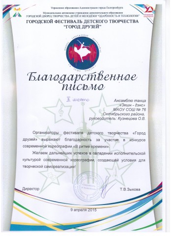 Поздравляем призёров (2 место) городского фестиваля детского творчества «Город друзей» хореографический коллектив школы № 76 «Экшн-дэнс» , руководитель Кузнецова Оксана Викторовна