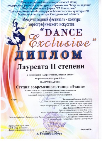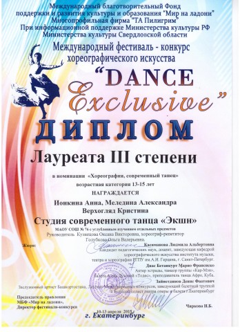 Студия современного танца «Данс-экшн» школы 76, руководитель Кузнецова Оксана Викторовна, стала лауреатом международного фестиваля-конкурса хореографического искусства «Dance Exclusive» сразу в двух номинациях «Хореография, современный танец» (диплом 3 степени) состав участников Ионкина Анна, Меледина Александра, Верхогляд Кристина и «Хореография, первые шаги» (диплом 2 степени). В составе жюри были Касиманова Л.А., кандидат педагогических наук, зав.кафедрой хореографического искусства РГПУ им.Герцена г. Санкт-Петербург, Диас Бетанкурт Марио Франсиско, преподаватель танца Афро, Куба, Зайнетдинов Д.Ф., зав.балетной труппой и ведущий солист театра оперы и балета г.Екатеринбург.