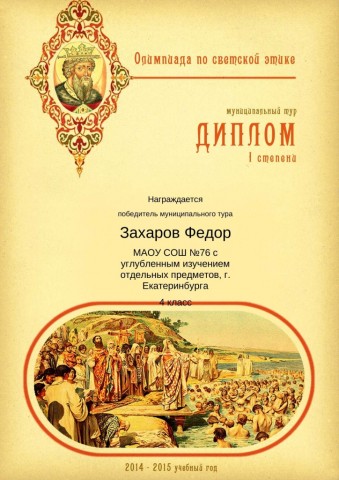От всей души поздравляем Захарова Фёдора ученика 4-б класса МАОУ СОШ №76, занявшего 1 место и педагога по ОРКСЭ Черепанову Валентину Михайловну.