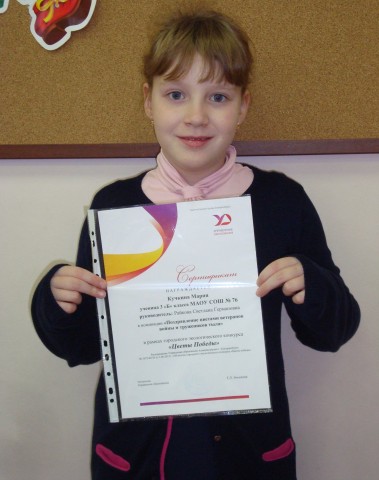 Поздравляем Кучкину Марию, ученицу 4-б класса, участницу Городского экологического конкурса «Цветы Победы», победителя в номинации «Поздравление цветами ветеранов войны и тружеников тыла».
