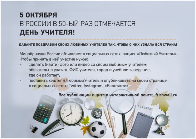 5 октября в России отмечается День Учителя, который в 2015 году отмечен особой датой- 50-летним юбилеем. В целях информационной поддержки праздничных мероприятий Минобрнауки России проводит всероссийскую акцию «Любимый учитель» в социальных сетях. Принять участие в акции могут школьники, студенты, их родители и учителя. Для этого необходимо делать фото и видео с учителями, сопровождать их поздравлением и размещать в социальных сетях с указанием хэштега # Любимый учитель. В акции могут принимать участие все те, кто уже окончил обучение, путем размещения архивных фотографий. Обязательным условием участия в акции является указание места ( школа, вуз, город, район), а также фамилии, имени и отчества учителя(ей), представленных на фото или видео.