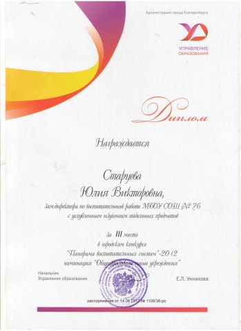 Школа № 76 стала призёром (3 место) городского конкурса «Панорама воспитательных систем»-2012 номинация «Общеобразовательные учреждения».