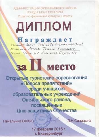 17 февраля 2016 года команда туристов нашей школы стала призёром в районных соревнованиях на «Полосе препятствий», посвящённой Дню защитника Отечества!