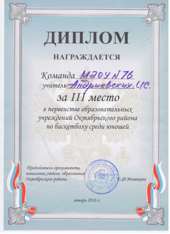 Поздравляем сборную команду школы, призеров (диплом за 3 место),первенства образовательных учреждений Октябрьского района по баскетболу среди юношей: