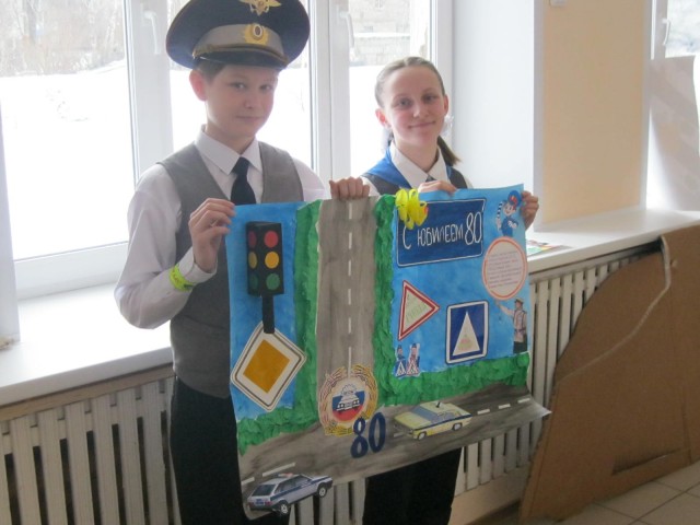 Отряд ЮИДД «Дорожные лучики» нашей школы поздравил юбиляров стихами, песнями и стенгазетой, которая заняла 2 место в конкурсе.