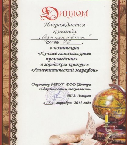 Поздравляем команду «Языкоплёты» в составе Подчинёнова Екатерина, Сапогова Арина, Шапочкин Александр , 7 «А» класс; Исеметова Надежда, Остапенко Наталья, 8 «Б» класс, победителей в номинации «Лучшее литературное произведение» городского конкурса «Лингвистический марафон».