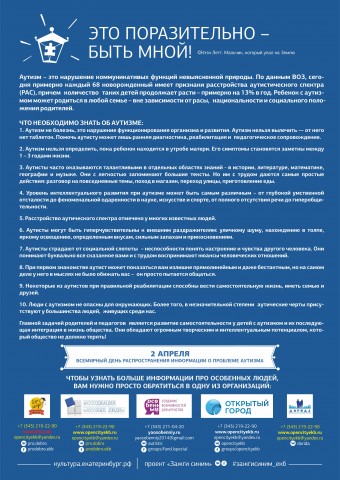 С 4 по 8 апреля в ОУ пройдет акция "Зажги синим". В рамках акции пройдут тематические беседы с обучающимися 5-11 классов, будут демонстрироваться информационные материалы посвященные проблеме аутизма