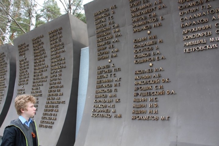 Сергей Валентинович Титлинов, руководитель авторского коллектива, генеральный директор Екатеринбургского художественного фонда провел экскурсию по мемориалу и познакомил учащихся и педагогов г. Екатеринбурга с шестью бронзовыми барельефами композиции "Вехи Великой войны": "Битва за Москву", "Блокада Ленинграда", "Сталинградская битва", "Битва на Курской Дуге", "Освобождение Европы от фашизма" и "Победители". Уникальные барельефы были открыты к 70-ой годовщине Победы в Великой Отечественной войне - 9 мая 2015 года.