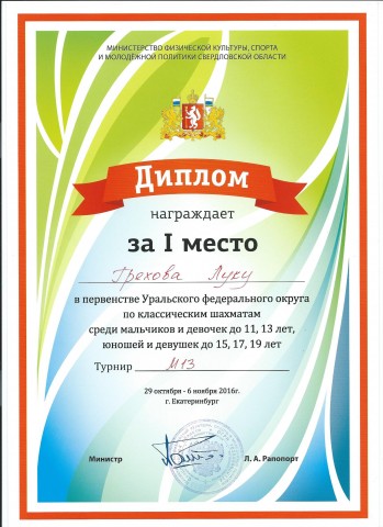 Грехов Лука, 5-б класс, стал победителем первенства Уральского федерального округа по шахматам среди мальчиков до 13 лет.