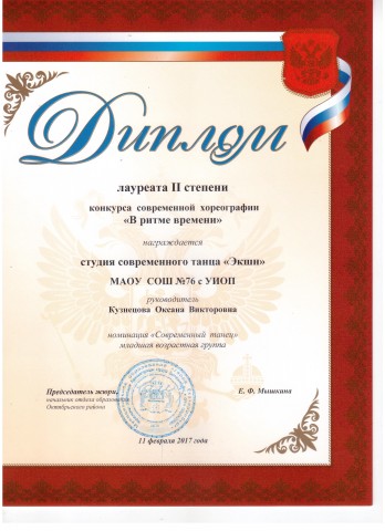 11 февраля 2017 года на сцене Гимназии №8 «Лицей им. С.П. Дягилева» прошел конкурс современной хореографии «В ритме времени» среди учащихся образовательных организаций Октябрьского района.