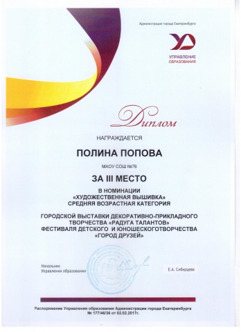 Поздравляем ученицу 5-в класса Попову Полину, занявшую 3 место в номинации "Художественная вышивка" городской выставки декоративно-прикладного творчества Фестиваля "Город друзей", руководитель: учитель технологии Ваулина Наталья Васильевна.