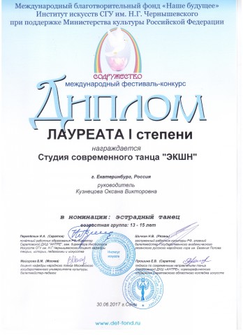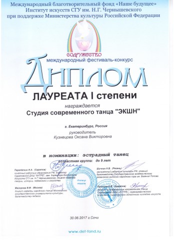 Дипломами лауреатов 1 степени награждены в номинации «Эстрадный танец», «Современный танец», «Современная пластика» возрастная группа до 9 лет, 10-12 лет; 13-15 лет!