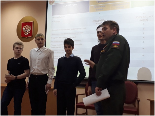 15 ноября 2017 года ученики 10-х классов побывали в военном комиссариате Свердловской области на встрече с начальником отдела военного комиссариата Свердловской области по Октябрьскому и Ленинскому районам г. Екатеринбурга полковником запаса Аксеновым Юрием Викторовичем. На встрече ребятам рассказали об основных отличиях гражданских и военных ВУЗов, про их преимущества, отметили разнообразие направлений подготовки в военных ВУЗах России. Защита Отечества – это выбор энергичных, упорных и грамотных молодых людей!