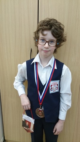 Поздравляем ученика 2-б класса Ратнера Якова с успешным выступлением на городском турнире по быстрым шахматам. Яша получил получил медаль за 3 место в турнире С. Так держать!