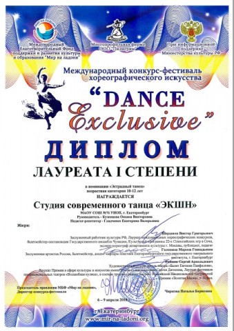 Поздравляем студию современного танца "Экшн" школы № 76, руководитель Кузнецова Оксана Викторовна, с победой ( лауреаты 1 степени) в Международном конкурсе-фестивале хореографического искусства "Dance Exclusive".