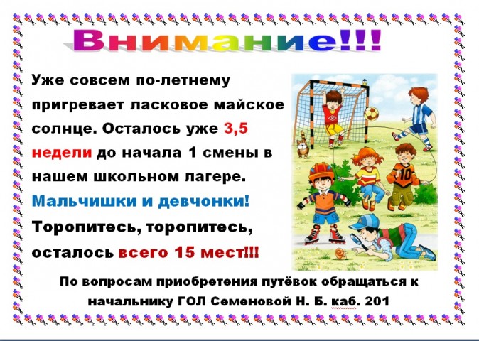 Родительское собрание по ГОЛ (городскому оздоровительному лагерю) состоится 17 мая в 18.00 часов в кабинете 132 (с собой иметь паспорт, ручку для подписания договоров).