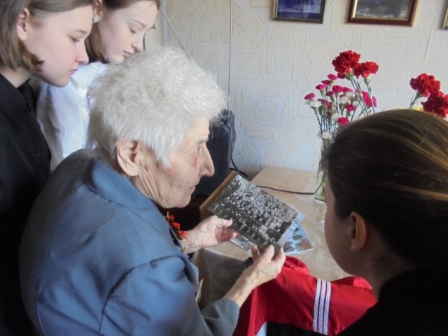 В преддверии Дня Победы ученики 8-в класса вместе с учителем русского языка и литературы Хиевой О.А., сотрудником Центра социального обслуживания населения Октябрьского района поздравили ветеранов Великой Отечественной войны с наступающим праздником на дому. 7 мая 2018 года поздравления принимали Червякова Галина Ивановна, фронтовая медсестра, почетный донор России. Галина Ивановна Червякова после трехмесячных курсов красных медсестер начала свой путь в госпитале, располагавшемся в 25-й школе Свердловска, что на улице Разина, затем были госпитали в Тихвине, Новгороде, Таллинне. На одну медсестру приходилось по тридцать больных и раненых. Сестрички выполняли всю работу по содержанию госпиталя, на своих плечах перевозили оборудование при частых переездах. В родной Свердловск Галина Ивановна возвратилась только в 1946 году. Множество жизней солдат спасла на фронте боевая медсестра. Ираида Власовна Очеретина — пережила восьмимесячную фашистскую оккупацию в г. Ростове. В феврале 1943 года пошла в армию. В 3-й гвардейской стрелковой дивизии служила рядовым трофейно-похоронной команды. После войны окончила филологический факультет Уральского университета. Журналист. В журнале “Урал” в 2005 году публиковались воспоминания о войне, о муже — писателе Вадиме Очеретине. Ираида Власовна – последний ветеран 3-й гвардейской Волновахской ордена Суворова стрелковой дивизии. Труженица тыла Тумаева Екатерина Павловна. Ветераны очень радушно встретили наших учеников, рассказали о войне, показали фотографии военных лет. Дали напутствие: не забывать подвиг старшего поколения, отстоявшего жизнь, беречь мир!