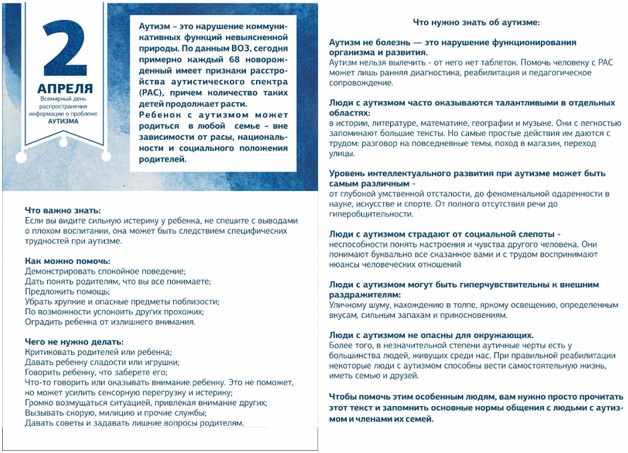 размещение информации об аутизме на экранах, информационных стендах, на сайтах и в социальных сетях. Состоятся «Уроки доброты» с показом фильма «Особый путь», созданного Ассоциацией организаций и граждан «Особые люди», рассказом о проблемах людей с аутизмом и правилах общения с ними.