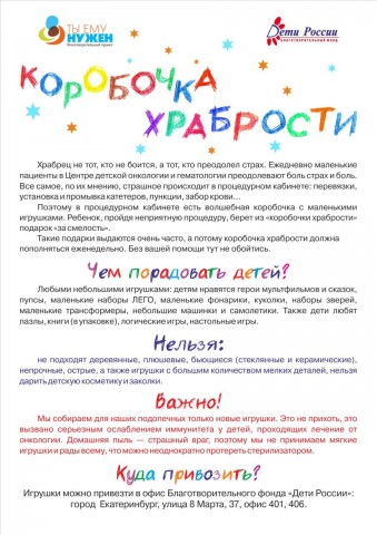 В школе № 76 в рамках благотворительного проекта «Ты ему нужен» проводится акция «Коробочка храбрости» ( сбор игрушек для пациентов Центра детской онкологии и гематологии), подробнее см. присоединенный файл