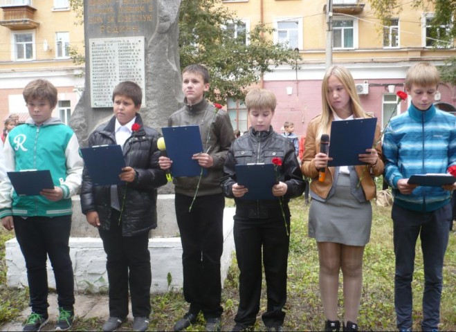 Урок Мужества у обелиска «Первогвардейцам» на Куйбышева,48 состоялся для учащихся 6-7-х классов 18 сентября 2013 года в рамках областной патриотической акции «Гвардия..Подвиг..Урал..» в честь знаменательной даты Свердловской области, Дня Советской гвардии. Учащиеся вместе с ветеранами возложили цветы к памятнику «Первогвардейцам», ребята из 7 «Б» класса представили литературно-музыкальную композицию, посвящённую подвигам 3-й Гвардейской Волновахской Краснознамённой ордена Суворова стрелковой дивизии и Уральскому добровольческому танковому корпусу.