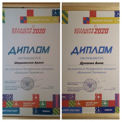 Учащиеся 11-в класса Шершевская Арина и Дунаева Аня при поддержке кураторов –педагогов Гусевой Валентины Анатольевны и Коробейниковой Марии Сергеевны стали полуфиналистами Всероссийского конкурса «Большая перемена» и приняли участие в уникальном мероприятии, организованном президентской платформой "Россия-страна возможностей».