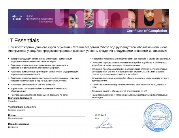 Курс сетевой академии Cisco IT Essentials («Основы информационных технологий») предоставляет базовые знания в области оборудования и программного обеспечения компьютеров, которые необходимы для удовлетворения растущего спроса на специалистов начального уровня в области информационных и коммуникационных технологий (ИКТ). Курс охватывает основы компьютерного оборудования и программного обеспечения, а также такие сложные темы, как безопасность, организация сетей и обязанности ИКТ-специалиста. В МАОУ СОШ №76 , которая является авторизованной площадкой академий Cisco, состоялся первый выпуск учащихся, полностью освоивших данный курс.